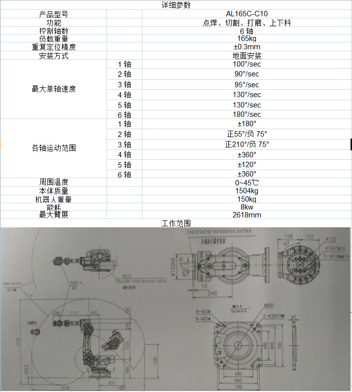 AL165C-C10型工业机器人整个系统结构紧凑,重复定位精度高,动态性能好,操作简单,采用总线结构,扩展应用方便,能够在点焊、搬运、铸件打磨、激光切割等多个场合进行应用。